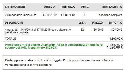 Se il cliente non prenta velocemente l’offerta, sul modulo di prenotazione compare questa frase “Purtroppo si è lasciato sfuggire la nostra offerta – per questo motivo per la Sua prenotazione vale il prezzo normale.”