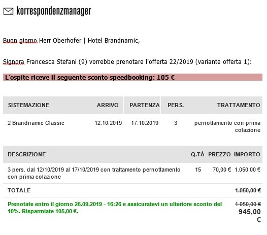 Speedbooking/Early bird è una funzione utilizzata per colmare rapidamente i vuoti di prenotazione e offrire agli ospiti sconti (sconti early bird) se prenotano entro un determinato periodo, ad esempio entro 48 ore dall'invio dell'offerta o entro la data XY.